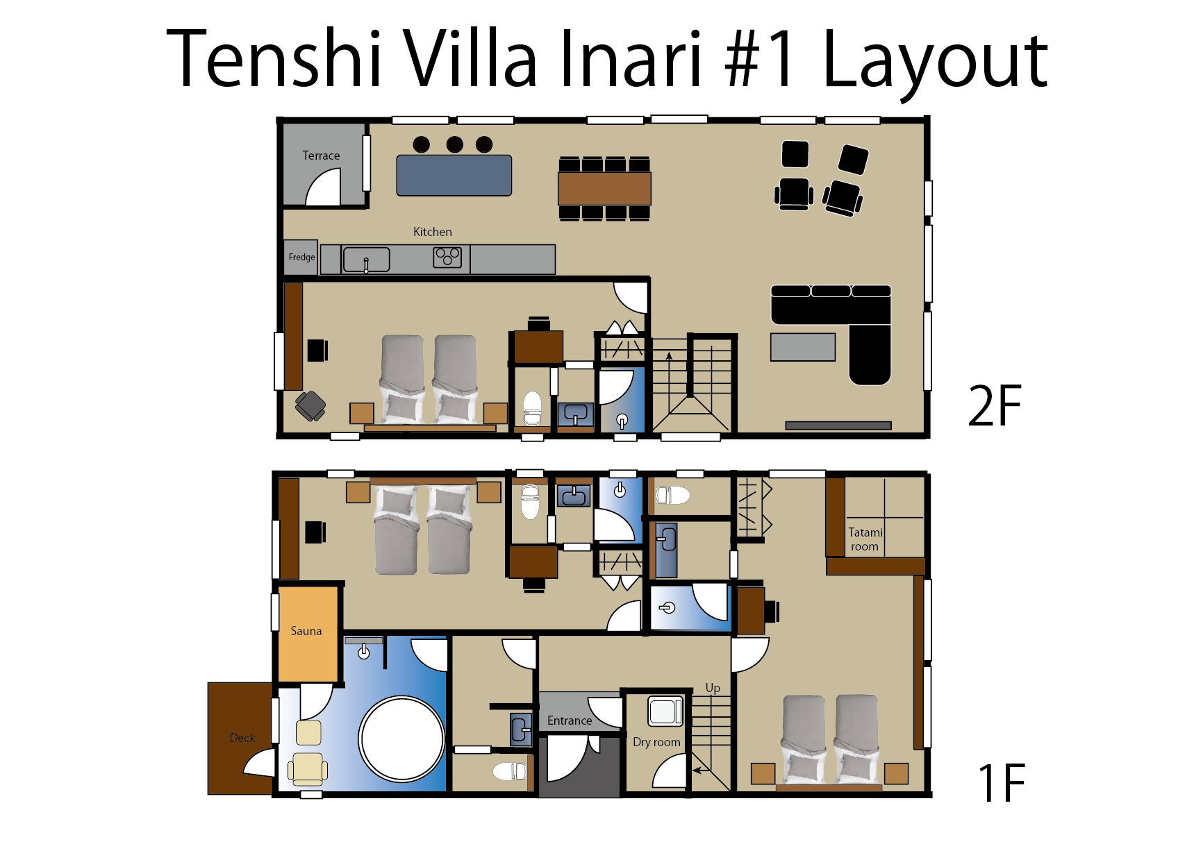 At the ground level, from the covered parking, there is easy entry into the main hallway with ski locker/dry/laundry room. There are 2 twin bedrooms where the beds can be set as singles or as king beds; each room has en-suite shower, vanity, toilet and closet space, and a built-in worktable. The master bedroom features a raised tatami platform that can accommodate two additional futons, ideal for families with young children.