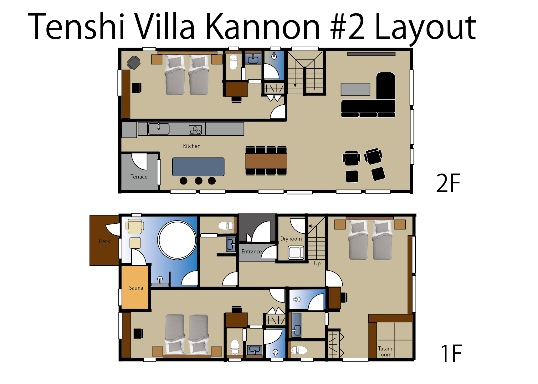 At the ground level, from the covered parking, there is easy entry into the main hallway with ski locker/dry/laundry room. There are 2 twin bedrooms where the beds can be set as singles or as king beds; each room has en-suite shower, vanity, toilet and closet space, and a built-in worktable. The master bedroom features a raised tatami platform that can accommodate two additional futons, ideal for families with young children.